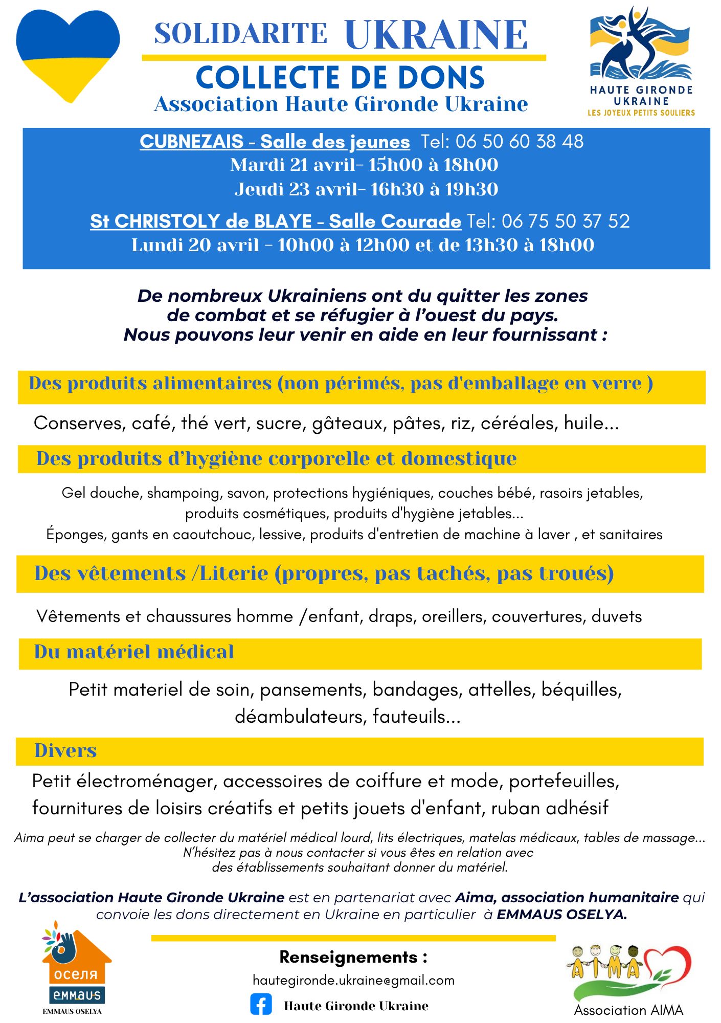 Nous travaillons en partenariat avec l' association AIMA qui s'occupe de la logistique et va compléter notre collecte.